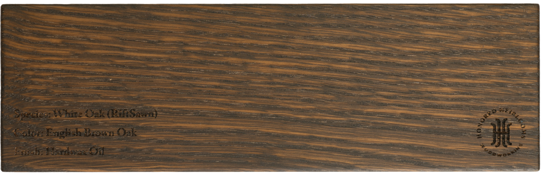 Shown here in English Brown stain, rift sawn white oak is valued for its clean, straight grain and refined appearance. Cut at a precise angle, it minimizes ray fleck while maximizing uniformity, resulting in a calm, linear look. Rift sawn white oak is highly stable and ideal for contemporary architectural designs where consistency and precision matter. It pairs beautifully with modern interiors while still offering the strength and longevity white oak is known for. Most notably, white oak is high in tannins which gives the wood unique properties that are prized in whiskey and wine making. Those same tannins can be used to fume the oak, giving it a rich dark chocolate appearance. If you are looking for a true, traditional color, ask us about ammonia fuming.